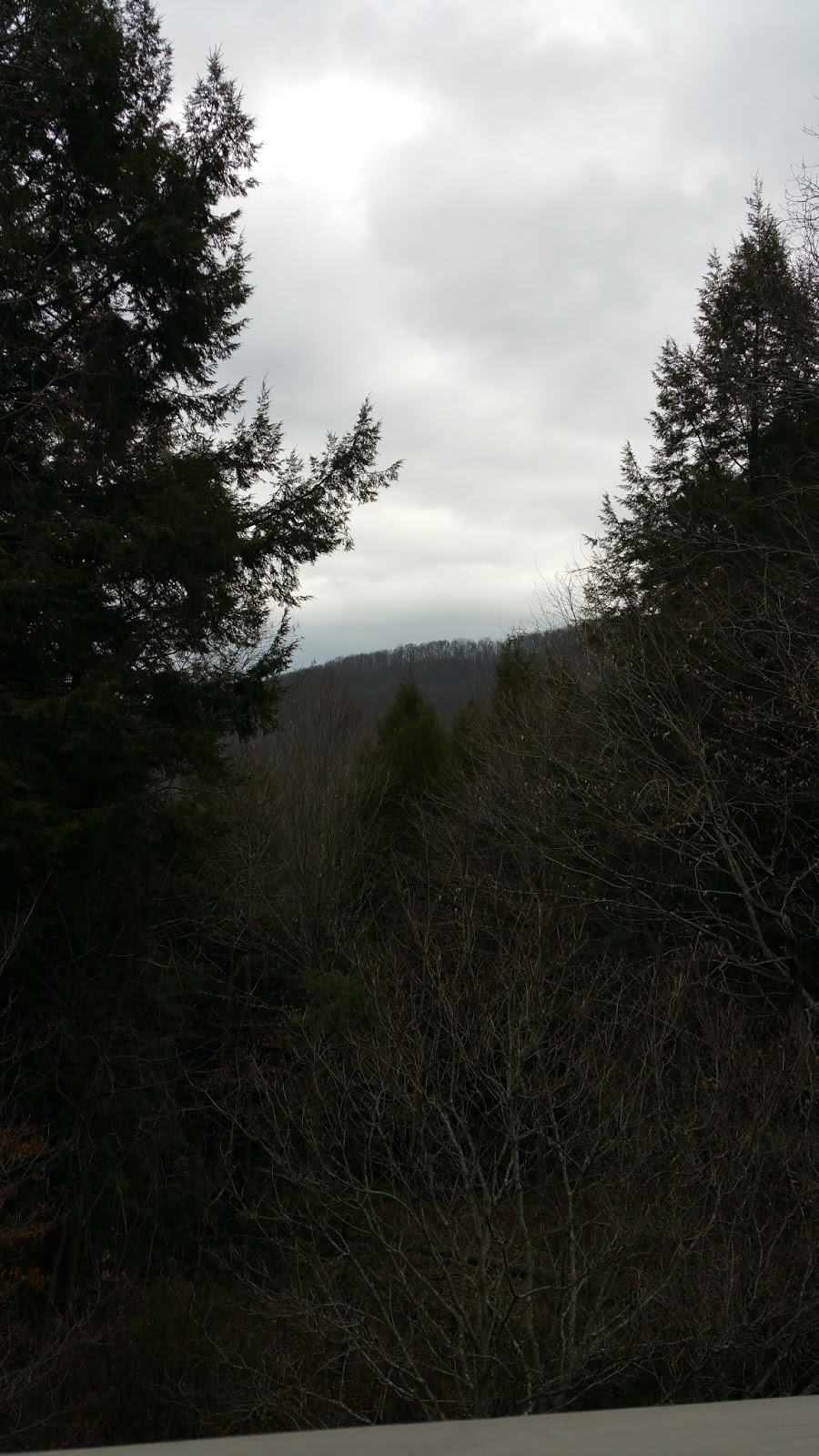 Outside the window tall weathered trees stood with